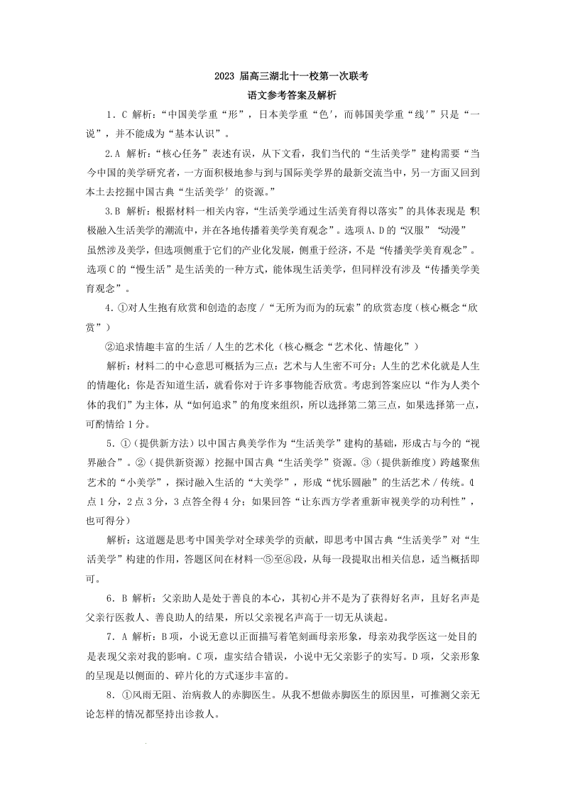 高三语文答案--湖北省十一校2023届高三上学期12月第一次联考