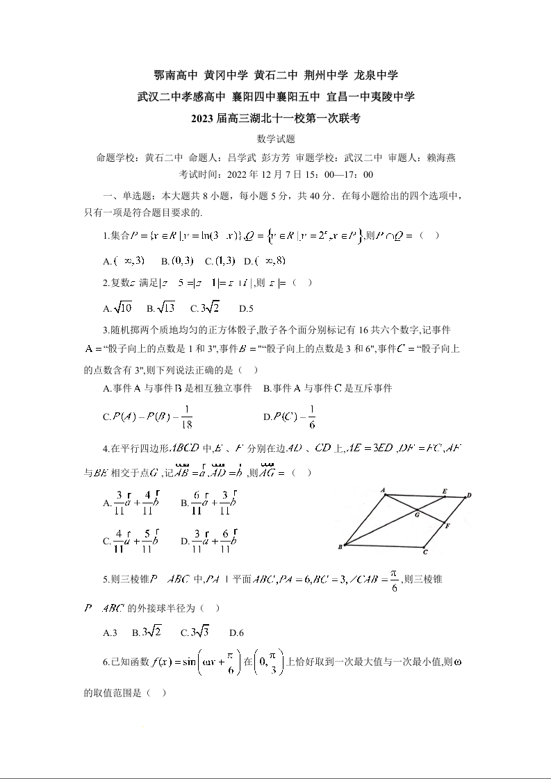 高三数学--湖北省十一校2023届高三上学期12月第一次联考