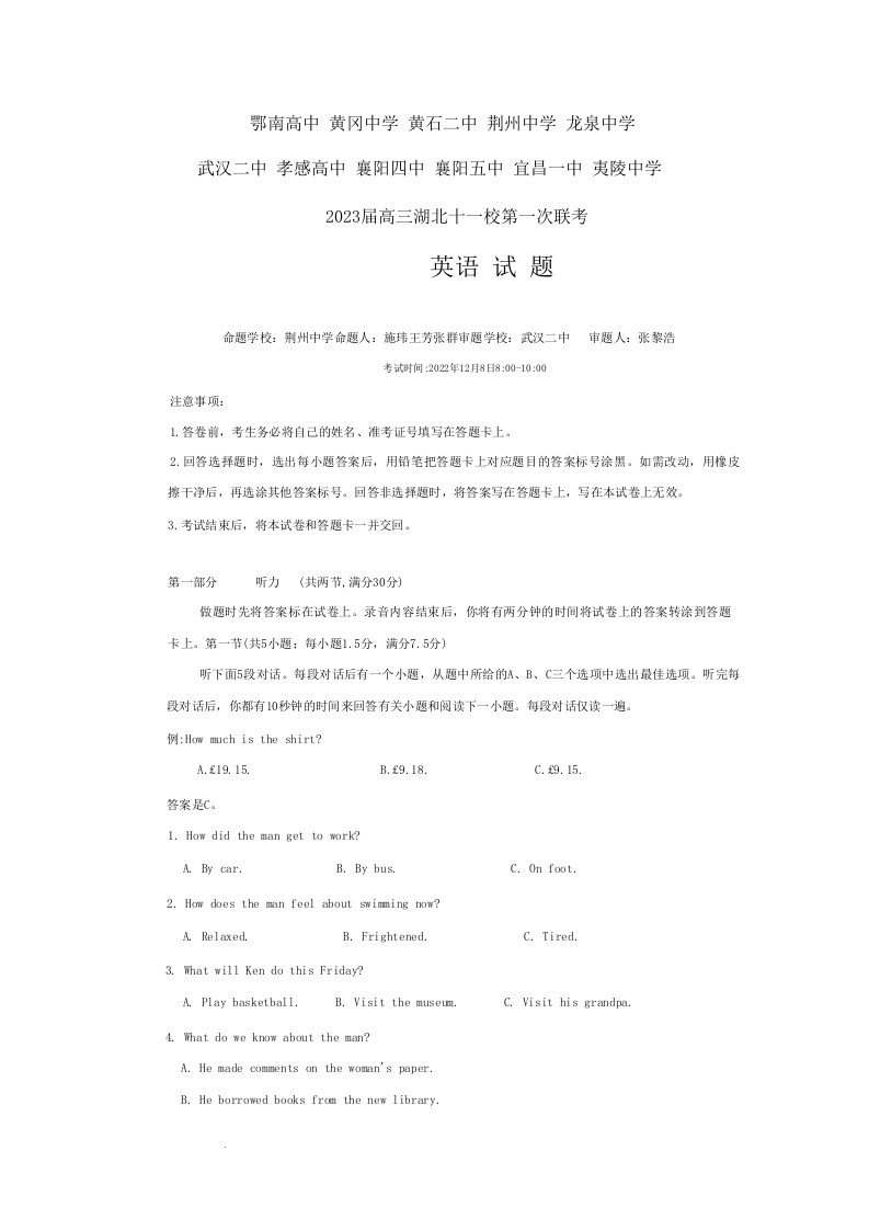 高三英语--湖北省十一校2023届高三上学期12月第一次联考
