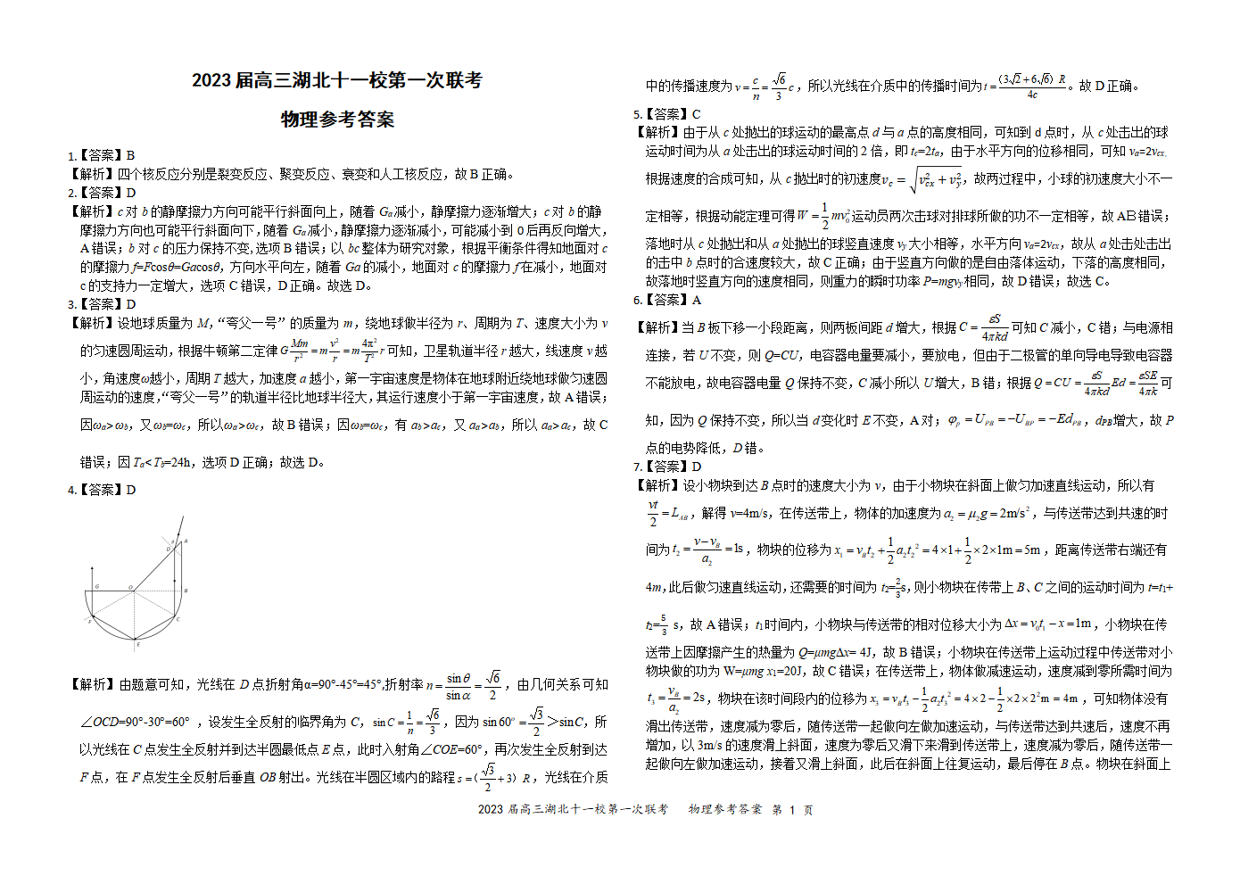 高三物理答案--湖北省十一校2023届高三上学期12月第一次联考