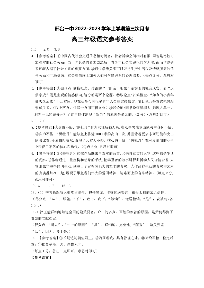 高三语文答案--河北省邢台市2022-2023学年高三上学期12月月考