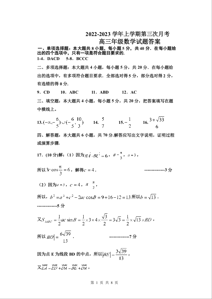 高三数学答案--河北省邢台市2022-2023学年高三上学期12月月考