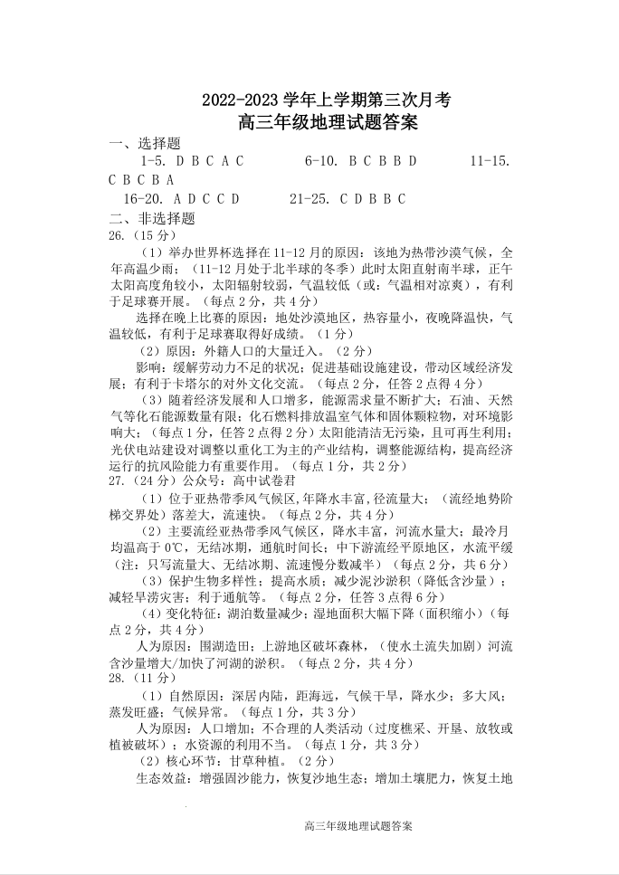 高三地理答案--河北省邢台市2022-2023学年高三上学期12月月考