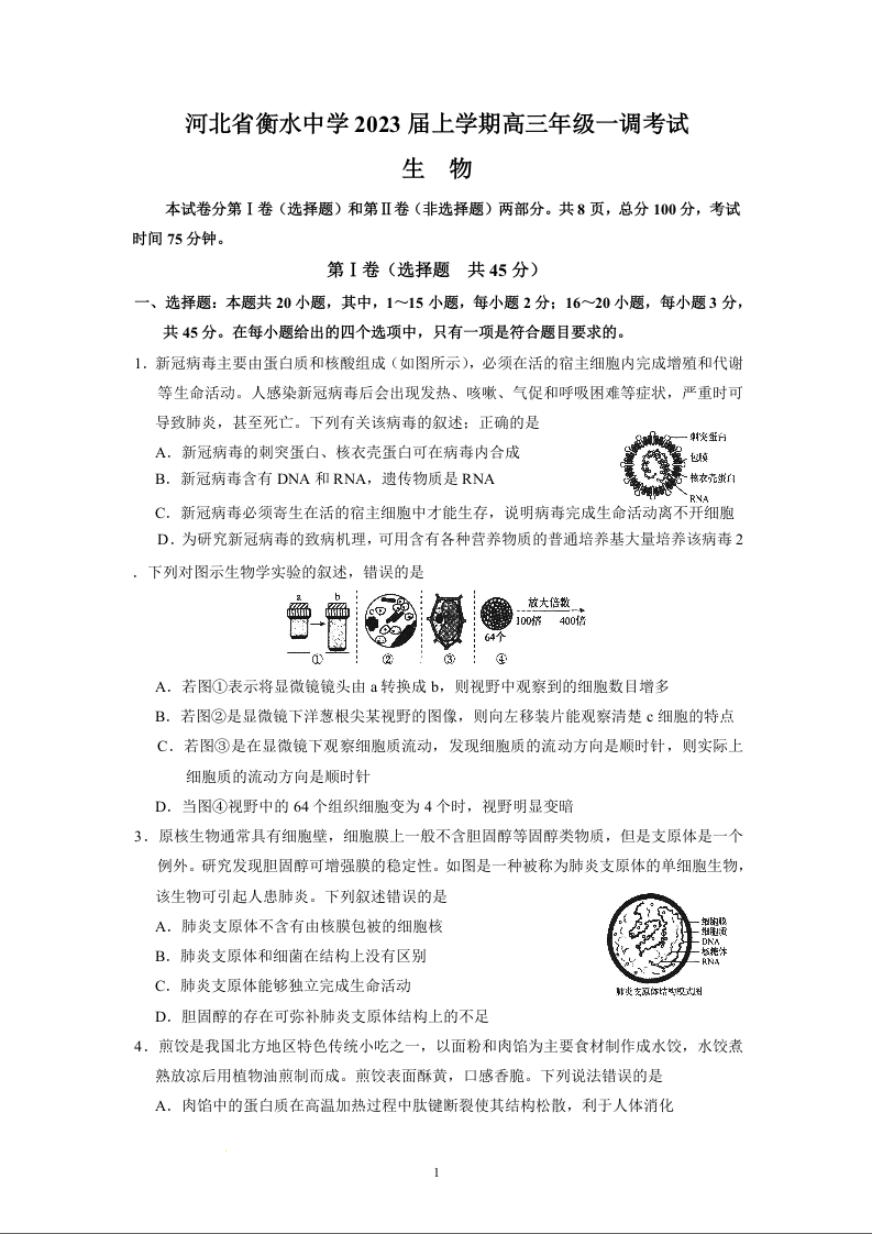高三生物+答案--河北省衡水中学2023届高三上学期一调考试