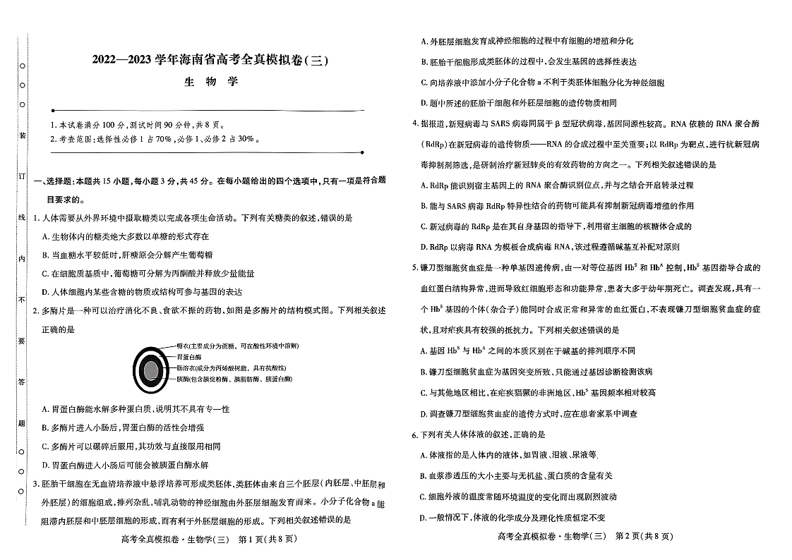 高三生物-海南省高三上2023届学期高考全真模拟(三)