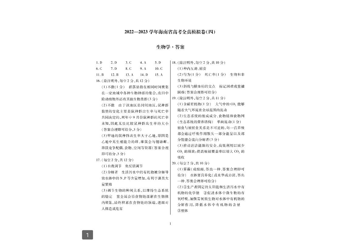 高三生物答案-海南省2022-2023学年高考全真模拟四