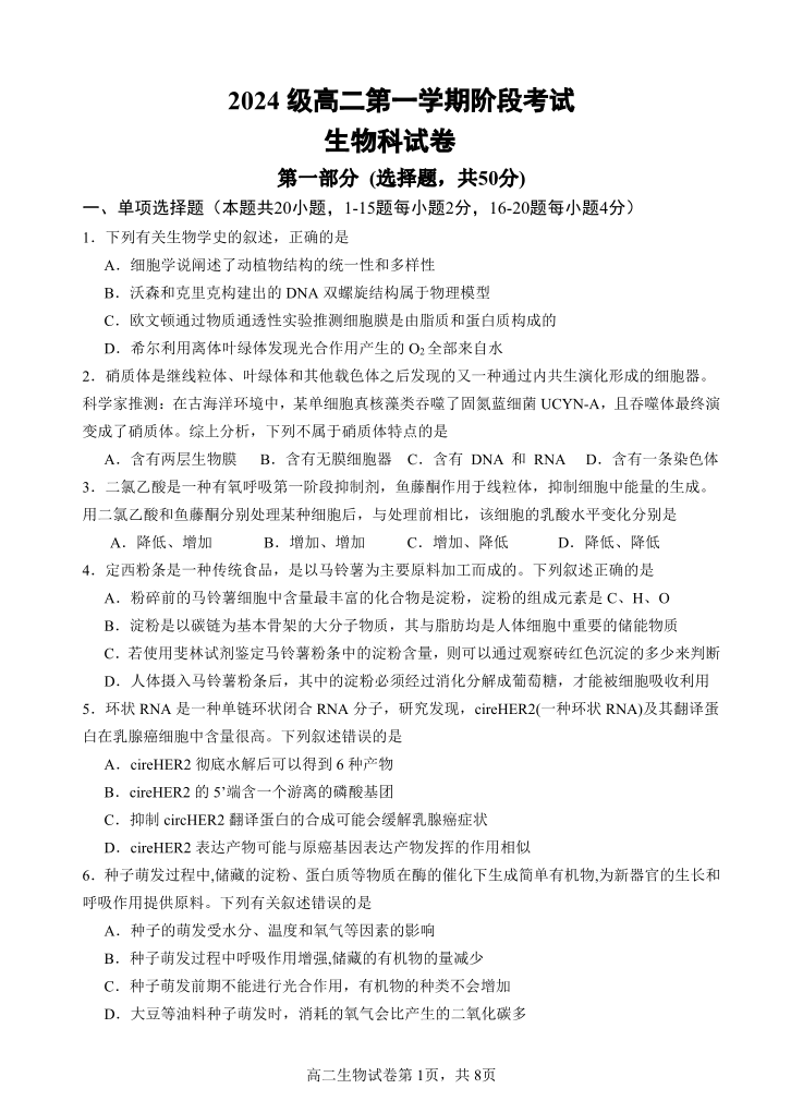 高二生物--广东省汕头市金山中学2025-2026学年高二上学期10月阶段考试
