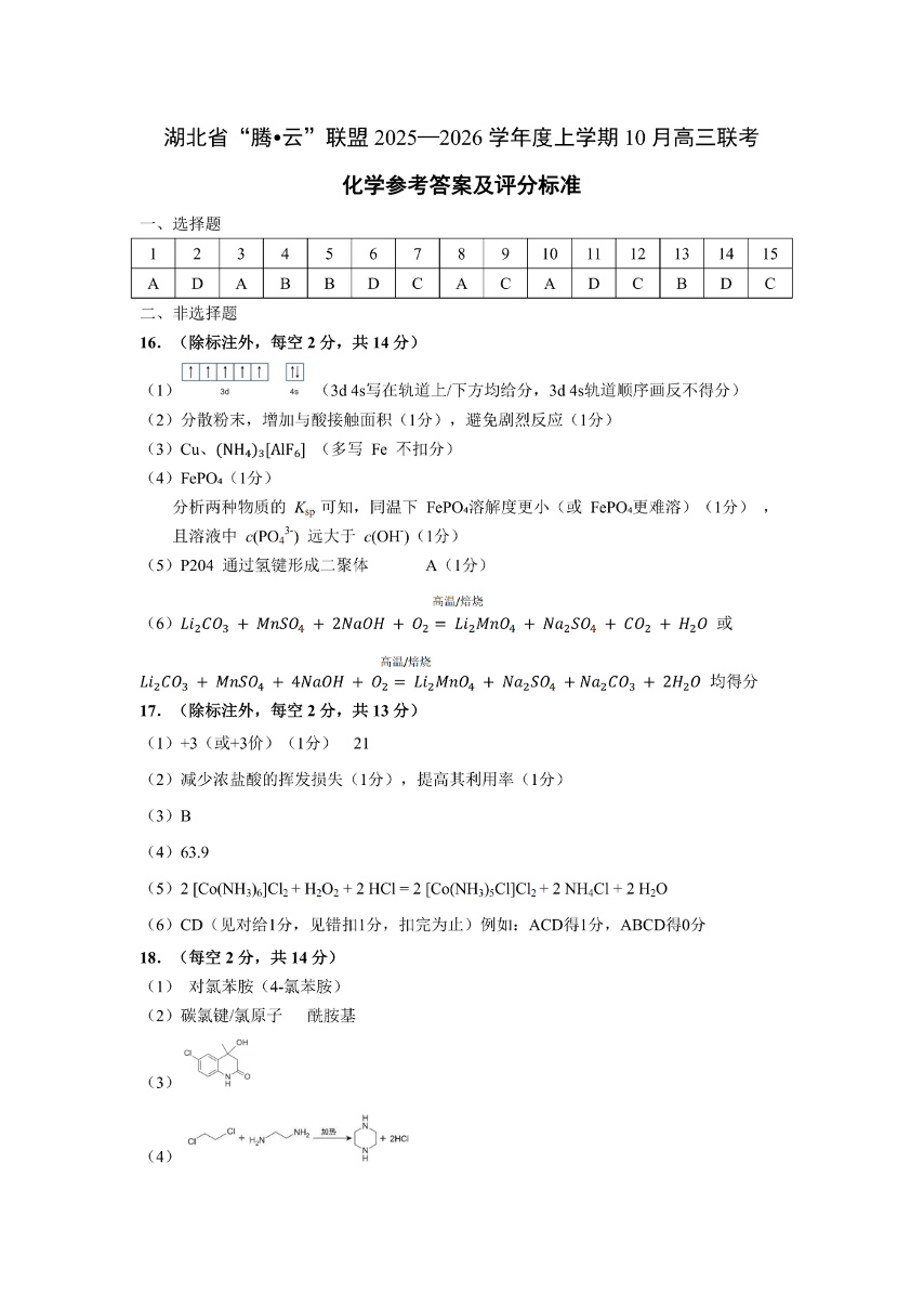 高三化学答案--湖北省腾云联盟2026届高三上学期10月联考