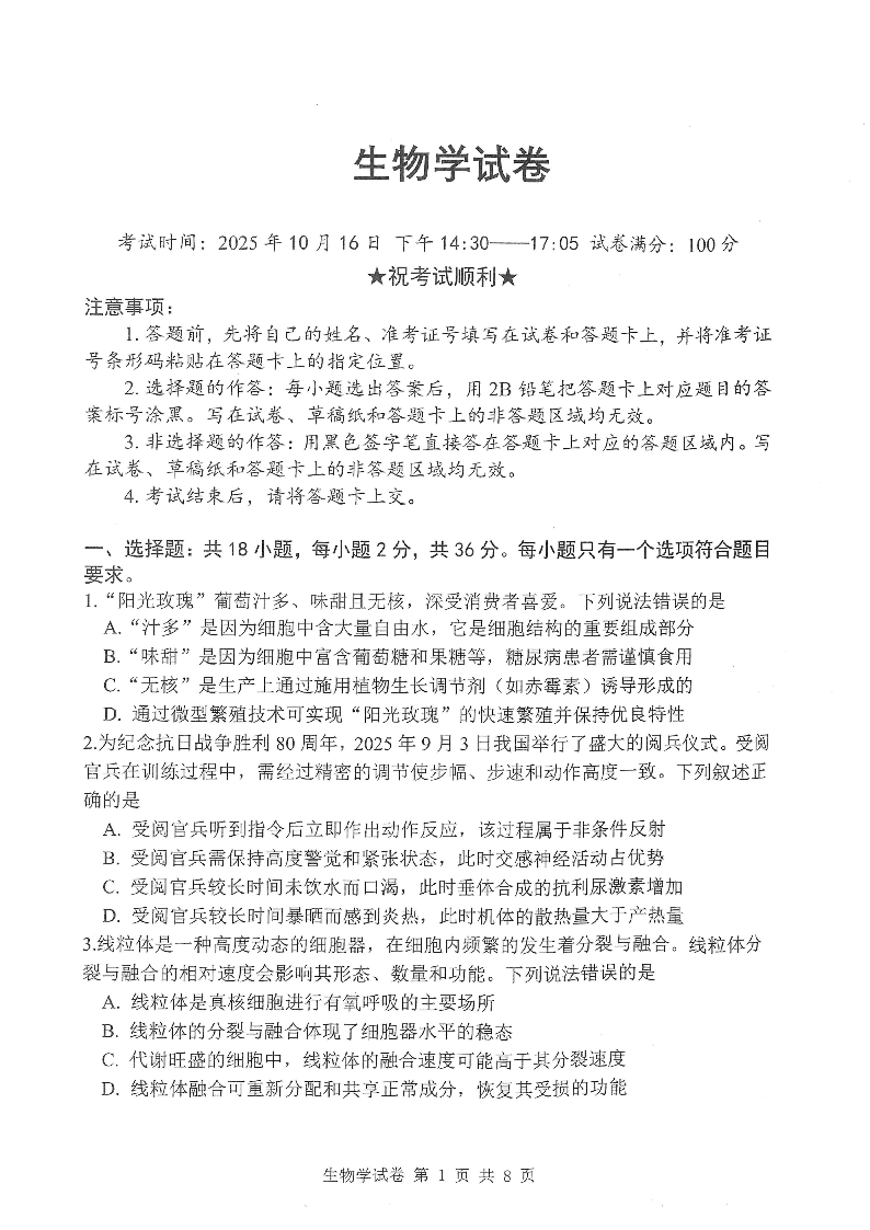 高三生物--湖北省腾云联盟2026届高三上学期10月联考