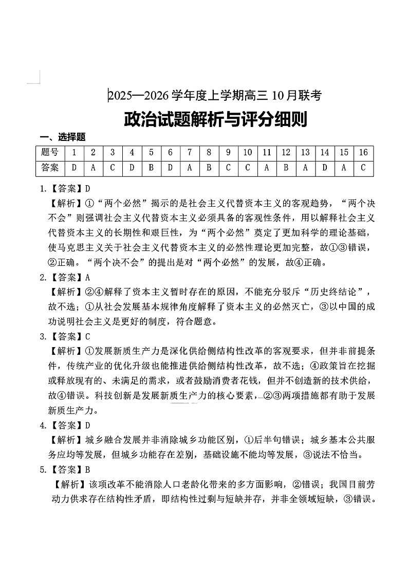 高三政治答案--湖北省腾云联盟2026届高三上学期10月联考