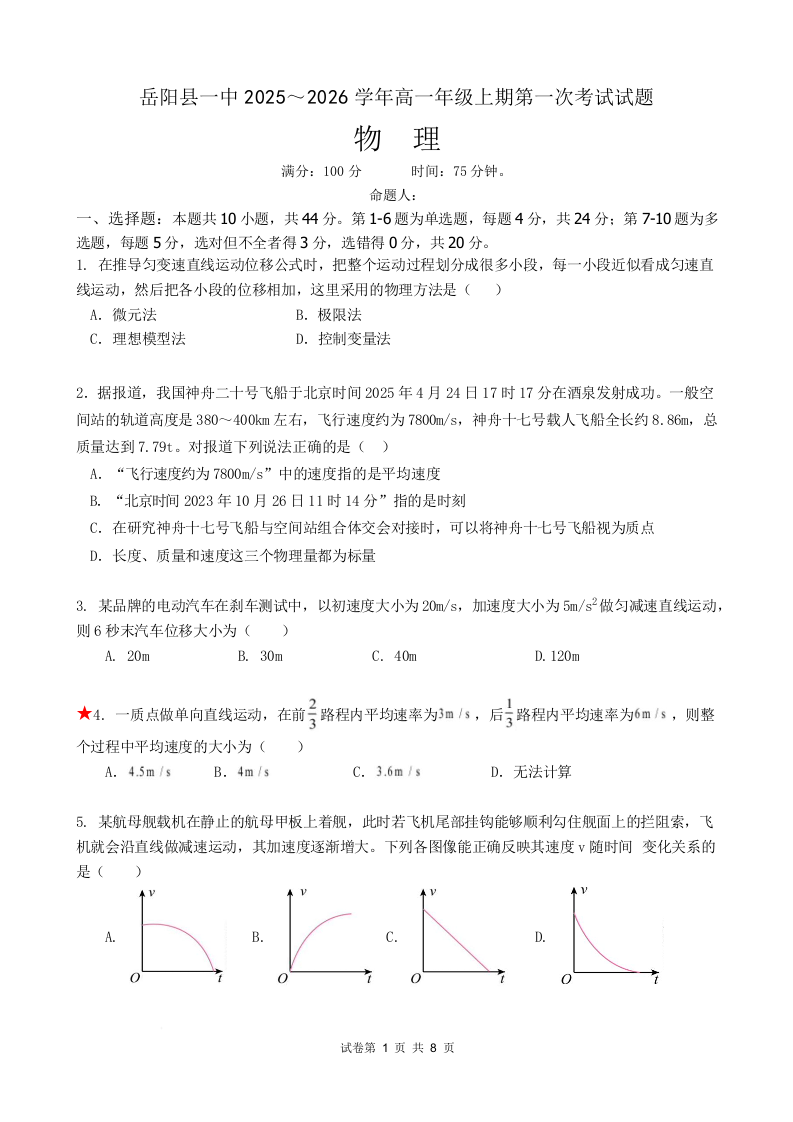 高一物理+答案--湖南省岳阳市岳阳县第一中学2025-2026学年高一上学期第一次月考