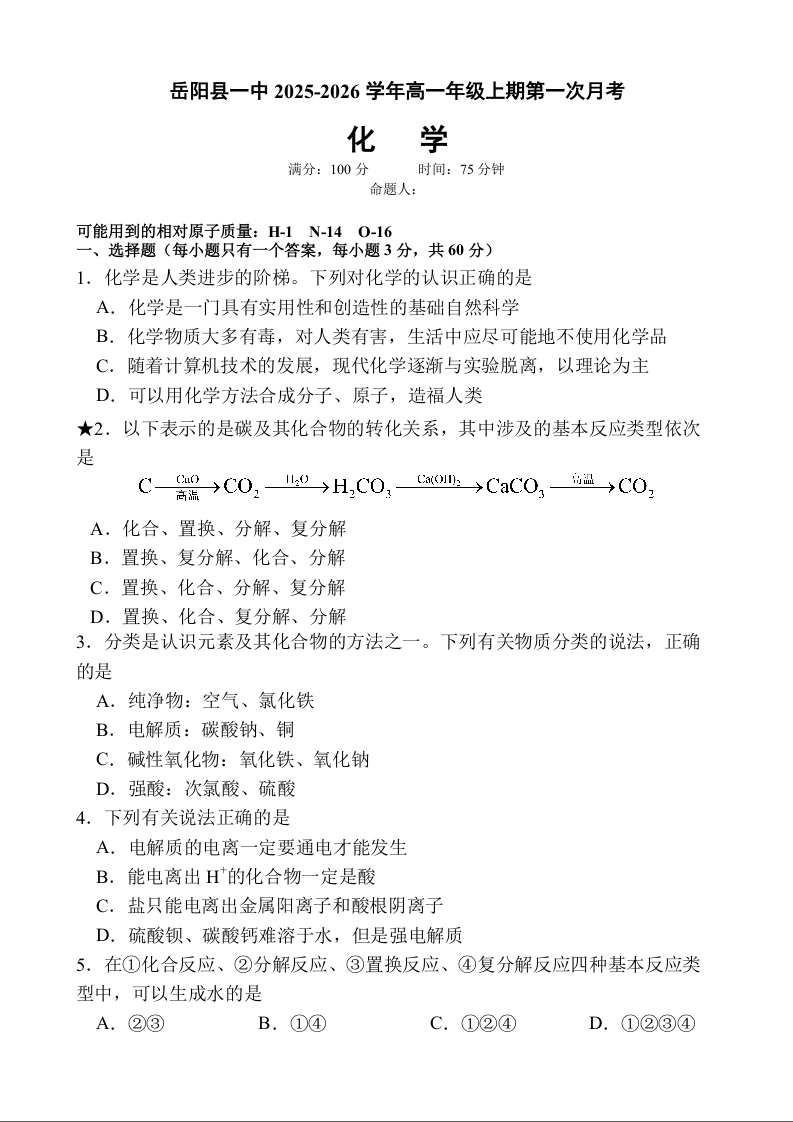 高一化学+答案--湖南省岳阳市岳阳县第一中学2025-2026学年高一上学期第一次月考