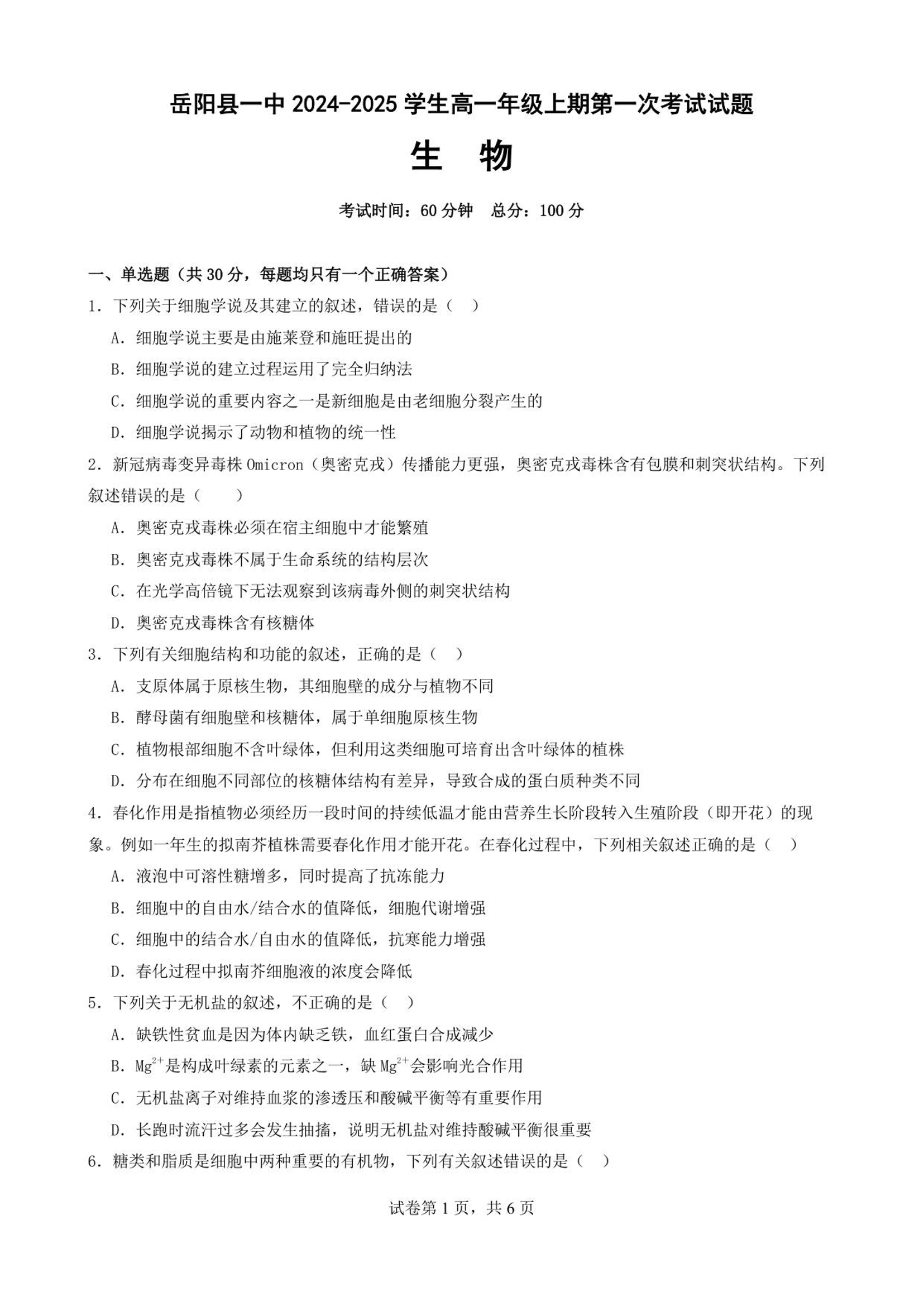 高一生物--湖南省岳阳市岳阳县第一中学2025-2026学年高一上学期第一次月考
