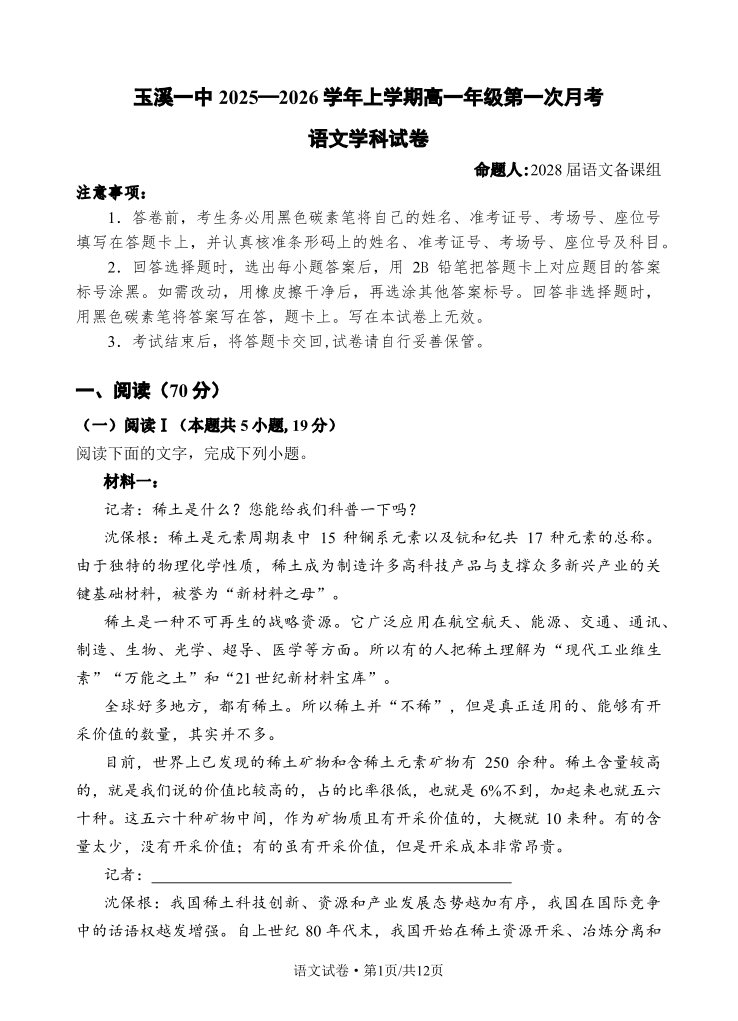 高一语文--云南省玉溪第一中学2025-2026学年高一上学期第一次月考