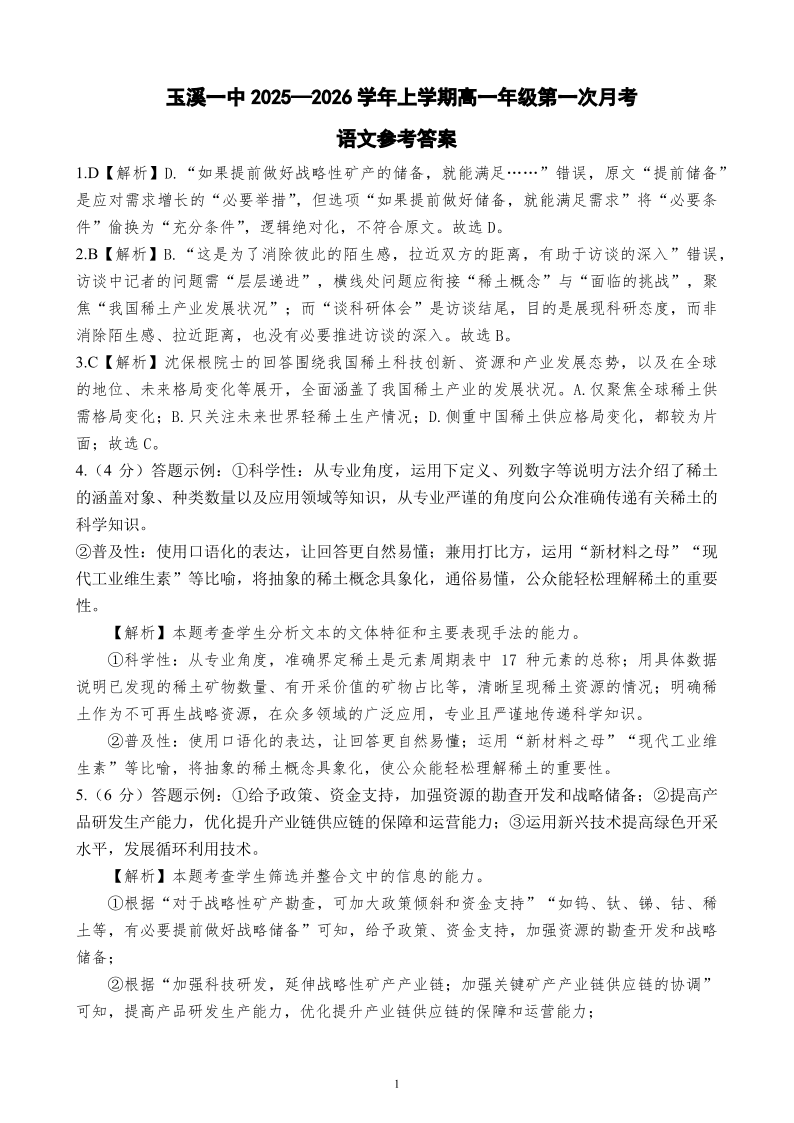 高一语文答案--云南省玉溪第一中学2025-2026学年高一上学期第一次月考