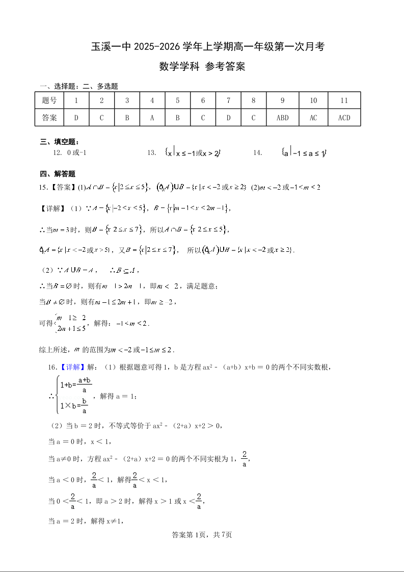 高一数学答案--云南省玉溪第一中学2025-2026学年高一上学期第一次月考