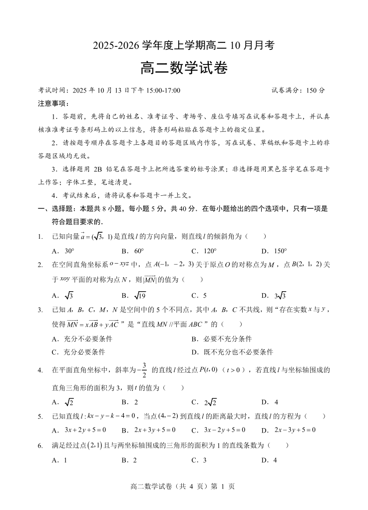高二数学--湖北省楚天协作体2025-2026学年度上学期高二10月月考