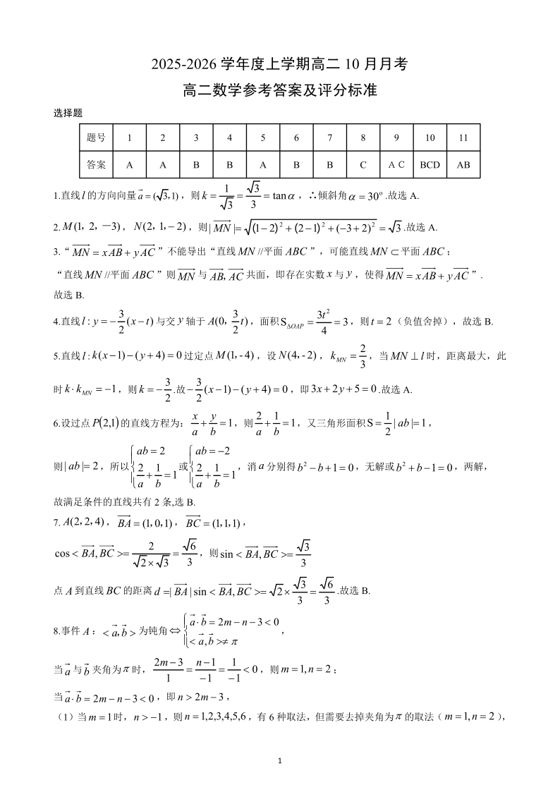 高二数学答案--湖北省楚天协作体2025-2026学年度上学期高二10月月考