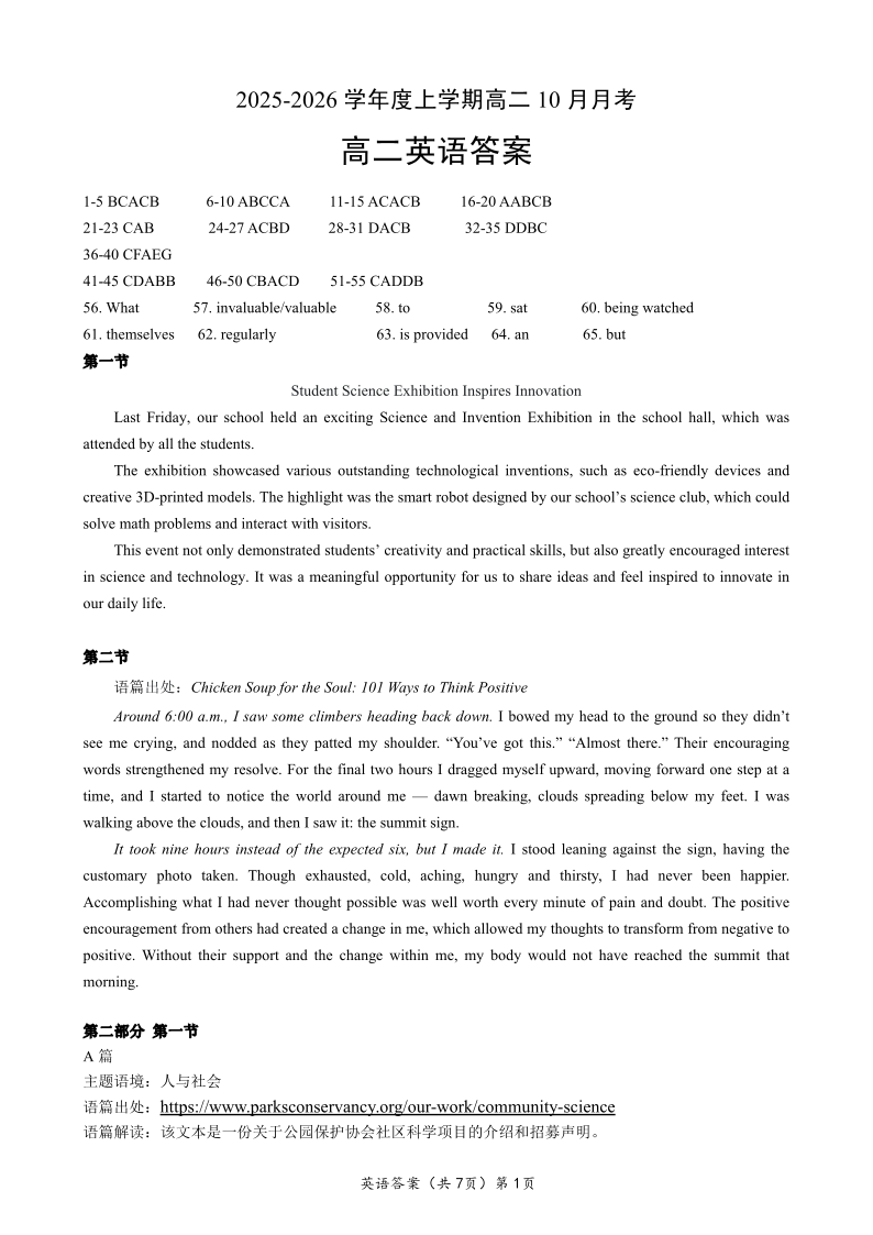 高二英语答案--湖北省楚天协作体2025-2026学年度上学期高二10月月考