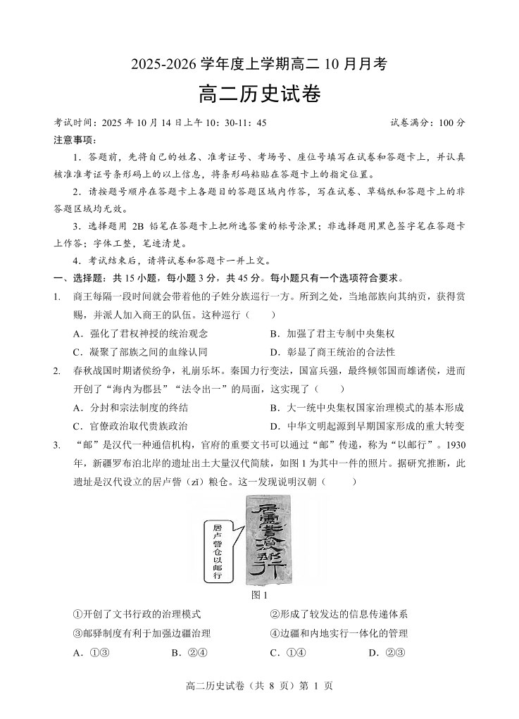 高二历史--湖北省楚天协作体2025-2026学年度上学期高二10月月考