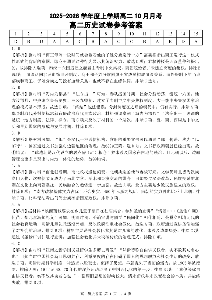 高二历史答案--湖北省楚天协作体2025-2026学年度上学期高二10月月考