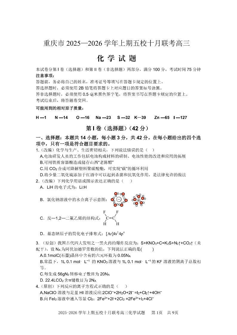 高三化学--重庆市五校联盟2026届高三10月联考