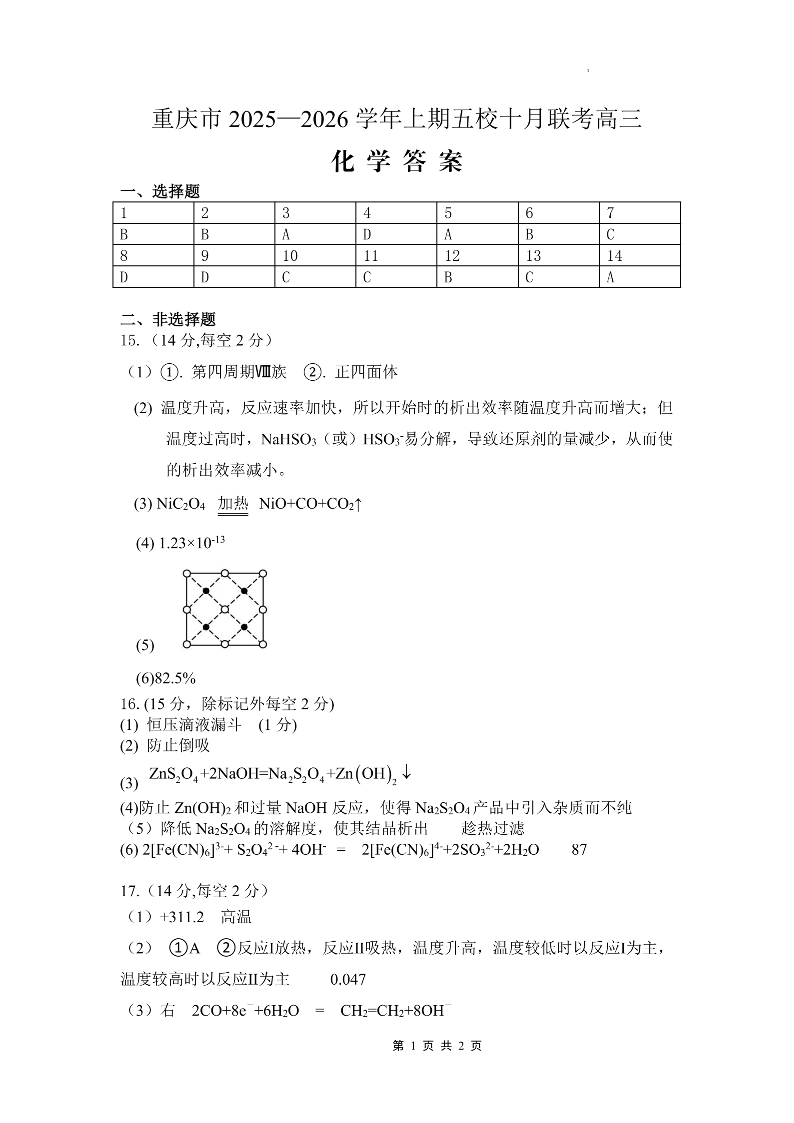 高三化学答案--重庆市五校联盟2026届高三10月联考