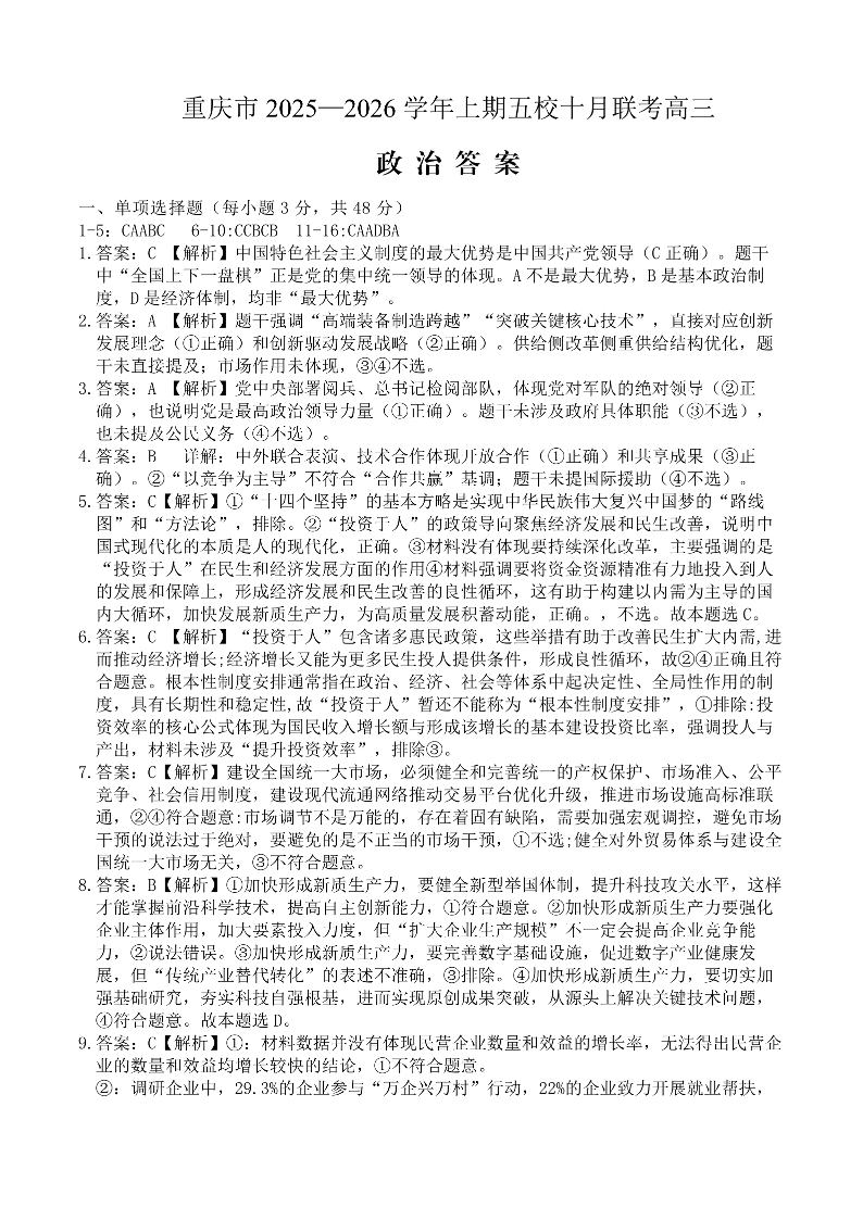 高三政治答案--重庆市五校联盟2026届高三10月联考