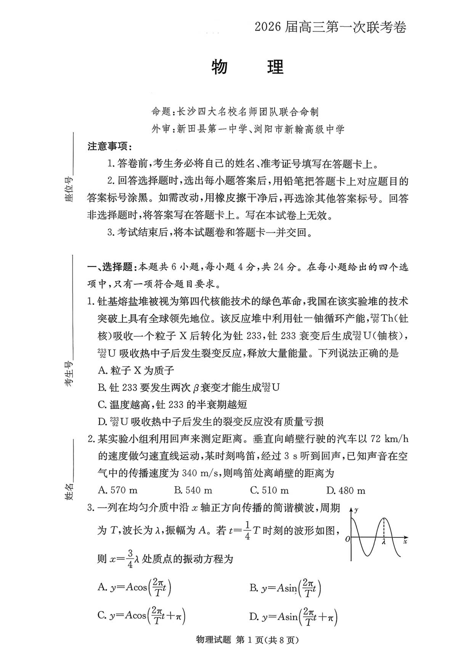 高三物理--湖南名校联考联合体2026届高三上学期10月月考