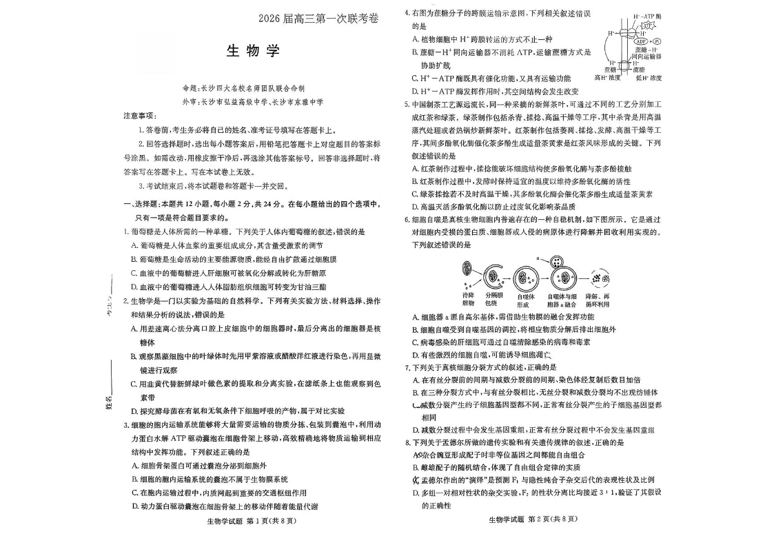 高三生物+答案--湖南名校联考联合体2026届高三上学期10月月考