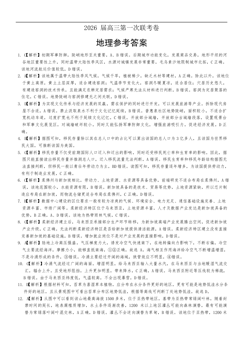 高三地理答案--湖南名校联考联合体2026届高三上学期10月月考