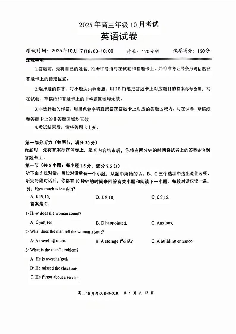 高三英语--湖北云学联盟2026届高三上学期10月考试