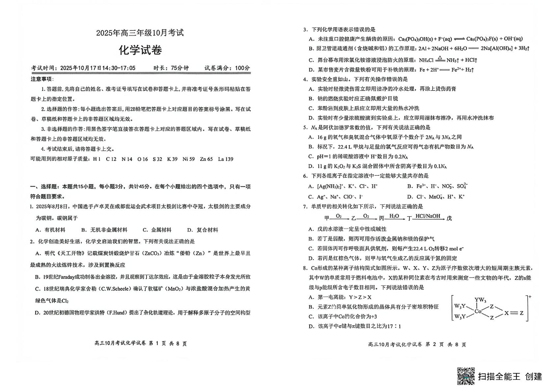 高三化学--湖北云学联盟2026届高三上学期10月考试