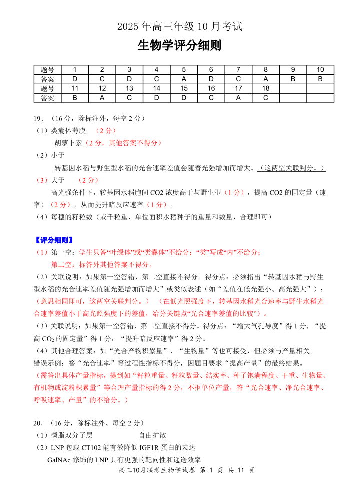 高三生物答案--湖北云学联盟2026届高三上学期10月考试