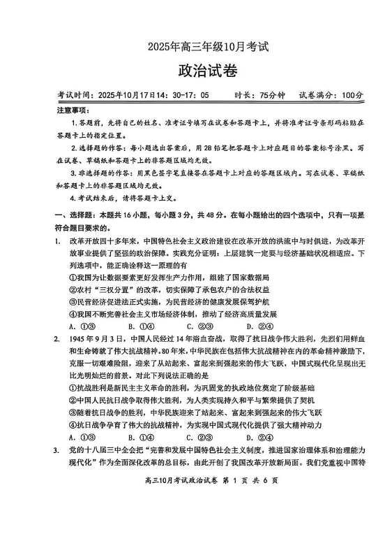 高三政治+答案--湖北云学联盟2026届高三上学期10月考试