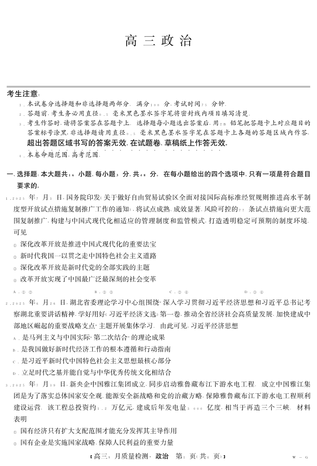 高三政治--湖北省九师联盟2026届高三9月质量检测巩固卷(10月联考)