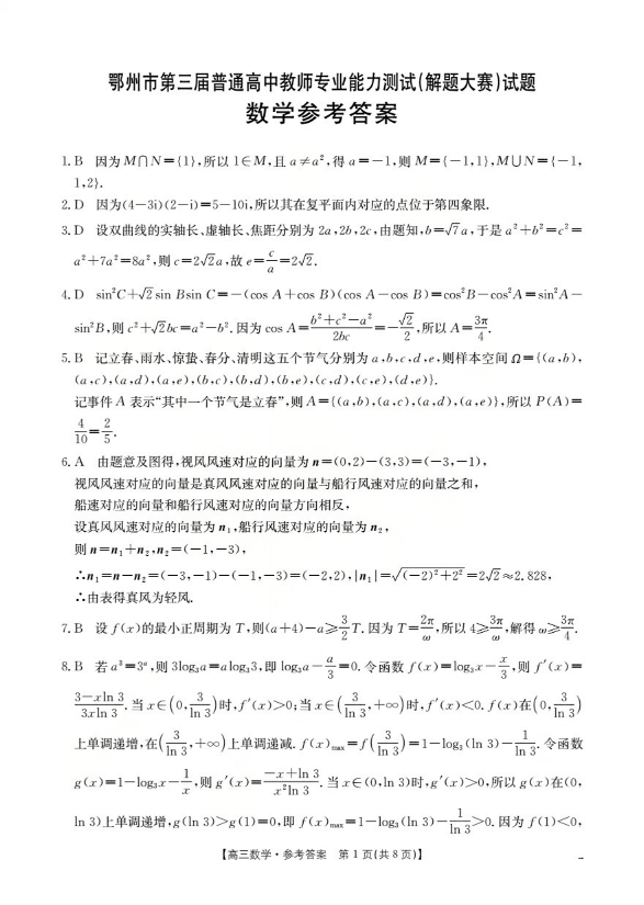高三数学答案--湖北省鄂州市2026届高三上学期第三届普通高中教师专业能力测试(解题大赛)