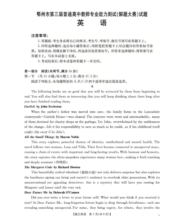 高三英语--湖北省鄂州市2026届高三上学期第三届普通高中教师专业能力测试(解题大赛)