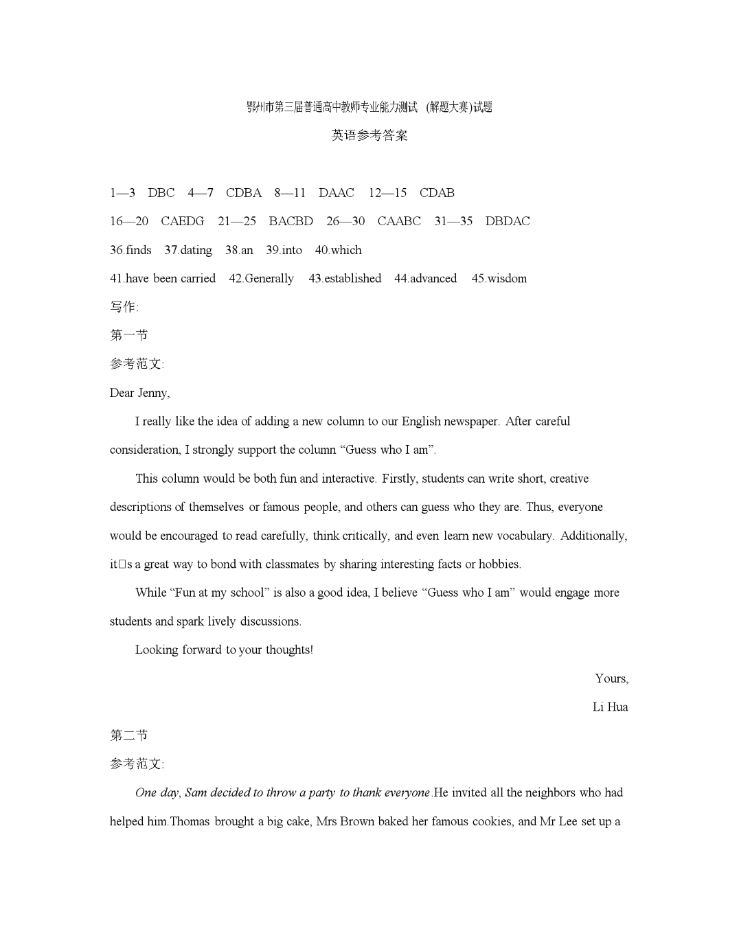 高三英语答案--湖北省鄂州市2026届高三上学期第三届普通高中教师专业能力测试(解题大赛)