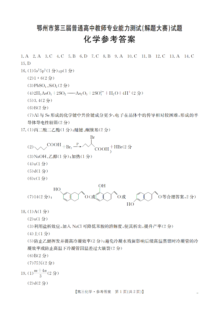 高三化学答案--湖北省鄂州市2026届高三上学期第三届普通高中教师专业能力测试(解题大赛)
