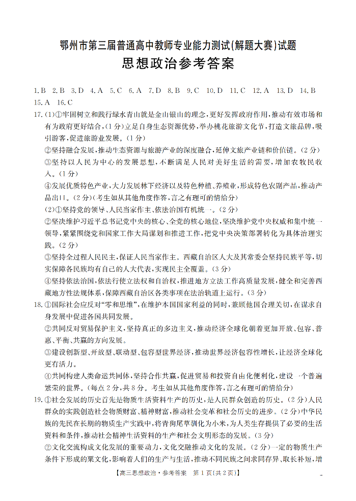高三政治答案--湖北省鄂州市2026届高三上学期第三届普通高中教师专业能力测试(解题大赛)