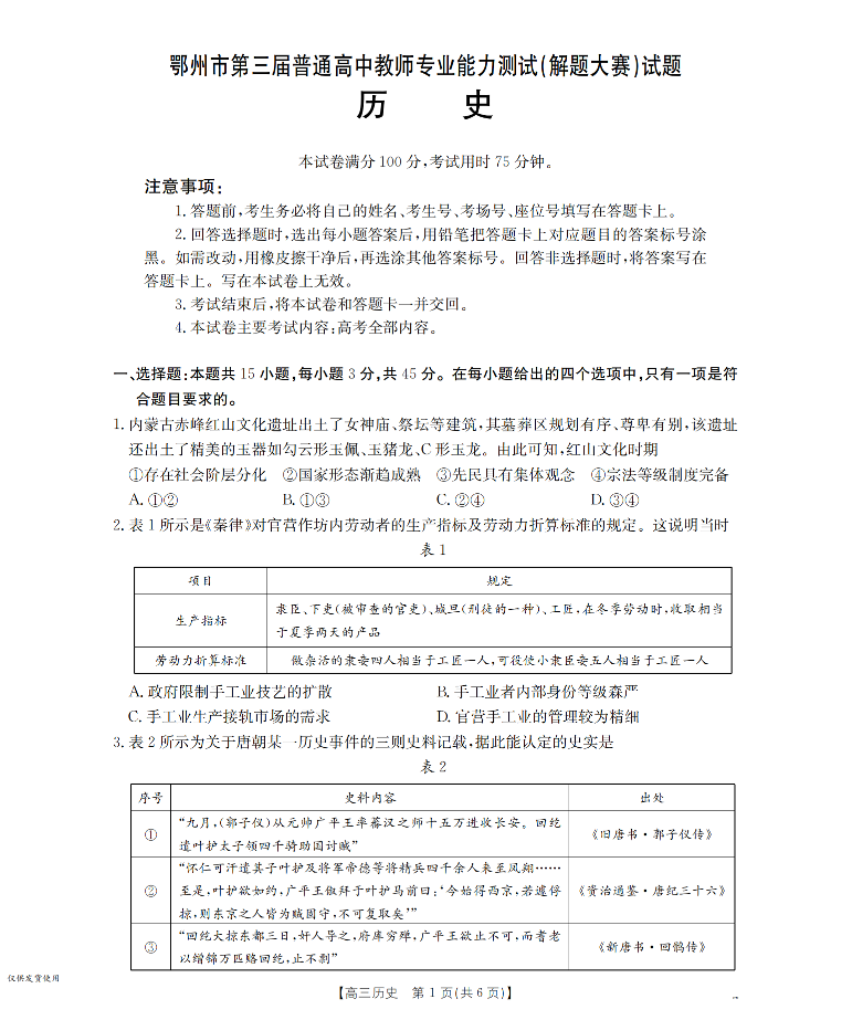 高三历史--湖北省鄂州市2026届高三上学期第三届普通高中教师专业能力测试(解题大赛)