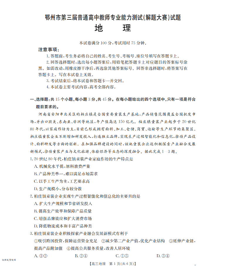 高三地理--湖北省鄂州市2026届高三上学期第三届普通高中教师专业能力测试(解题大赛)