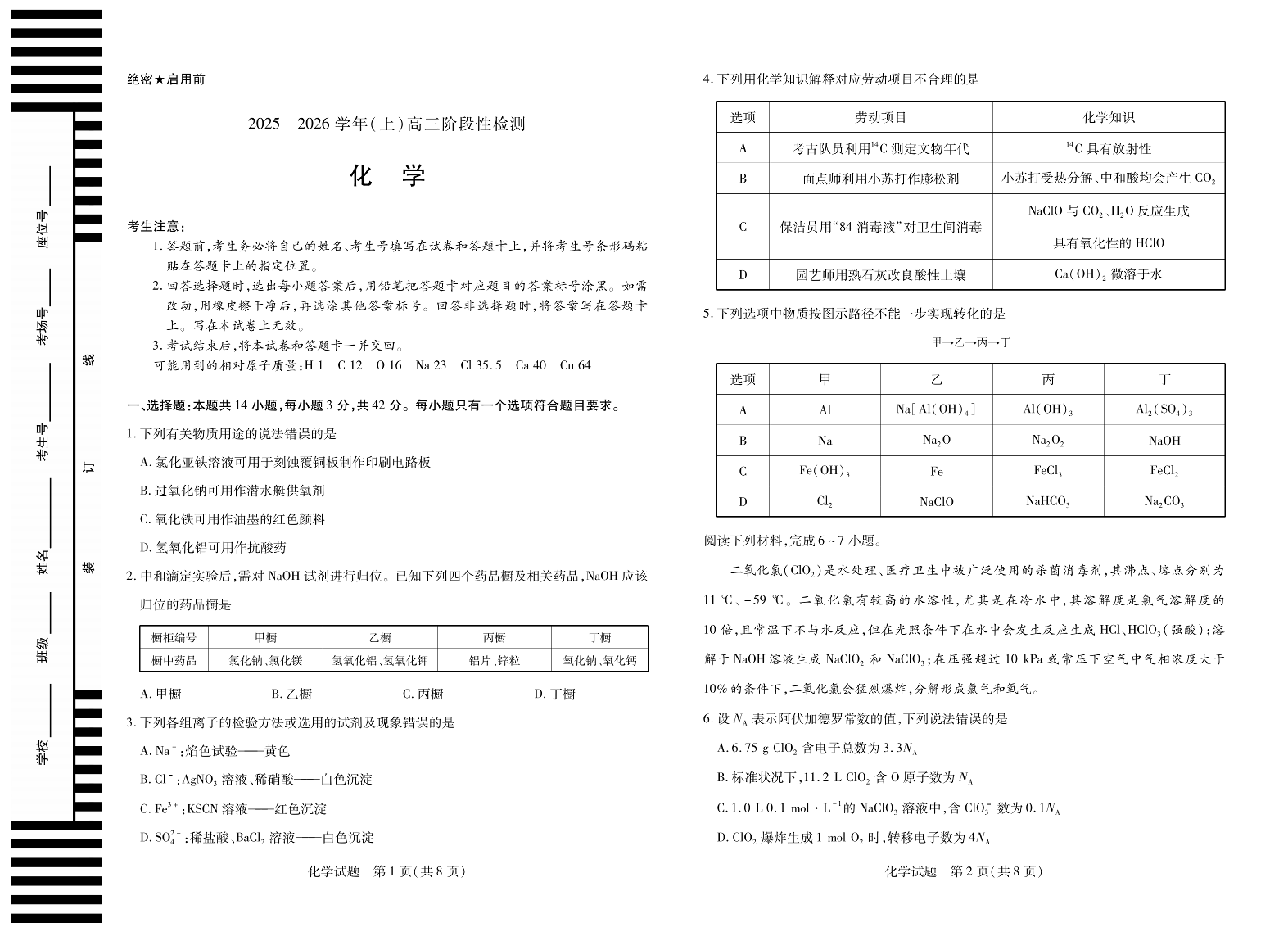 高三化学--河南省天一大联考 2026届高三10月阶段性检测