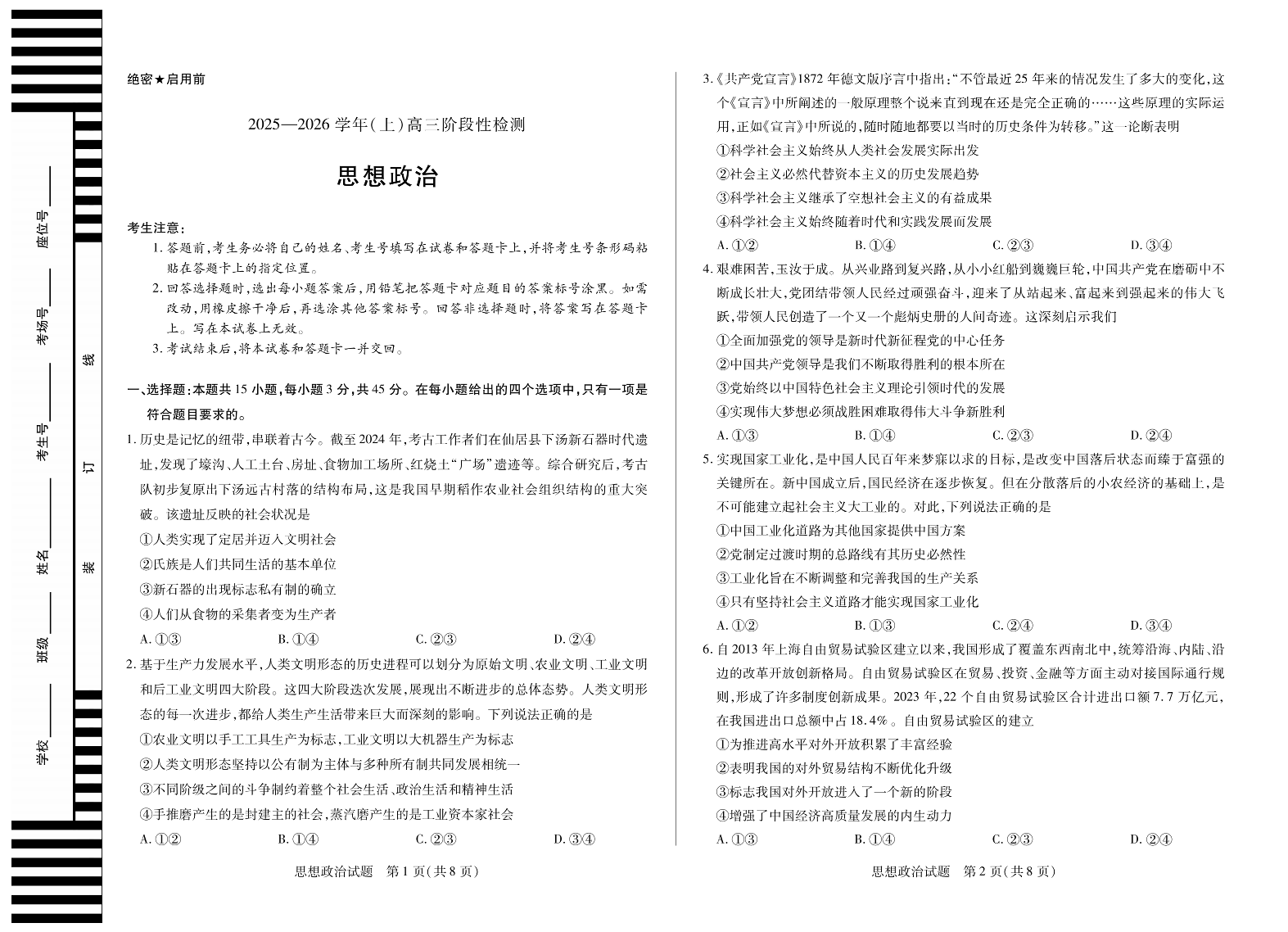 高三政治--河南省天一大联考 2026届高三10月阶段性检测