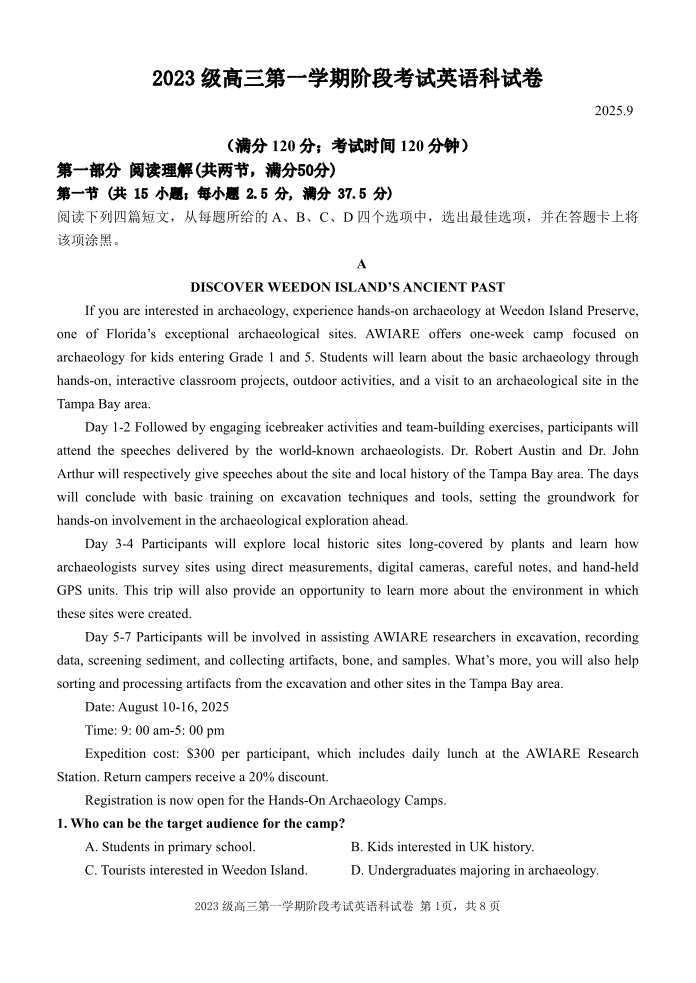 高三英语--广东省汕头市金山中学2026届高三上学期10月阶段考试