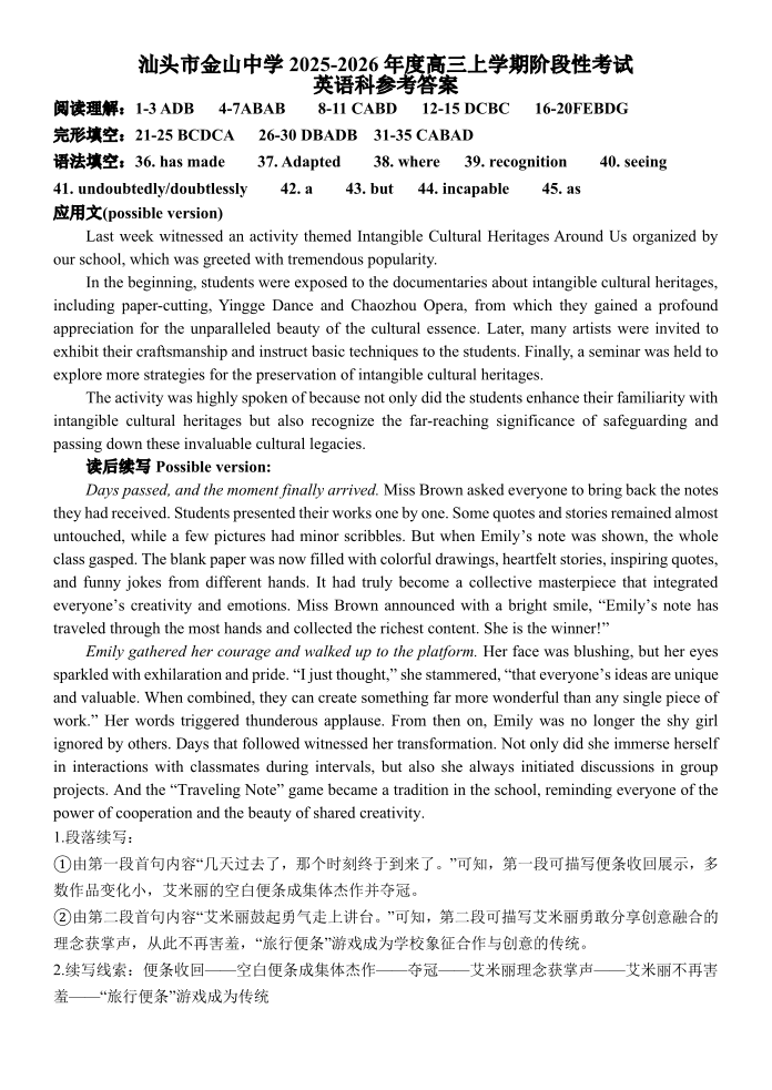 高三英语答案--广东省汕头市金山中学2026届高三上学期10月阶段考试