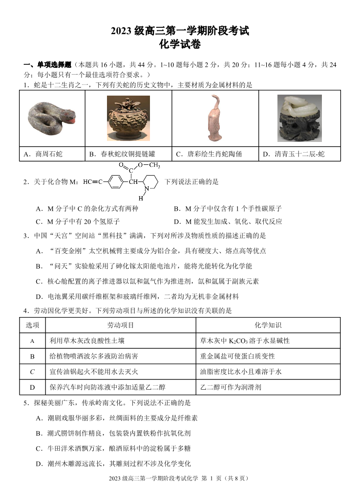 高三化学--广东省汕头市金山中学2026届高三上学期10月阶段考试