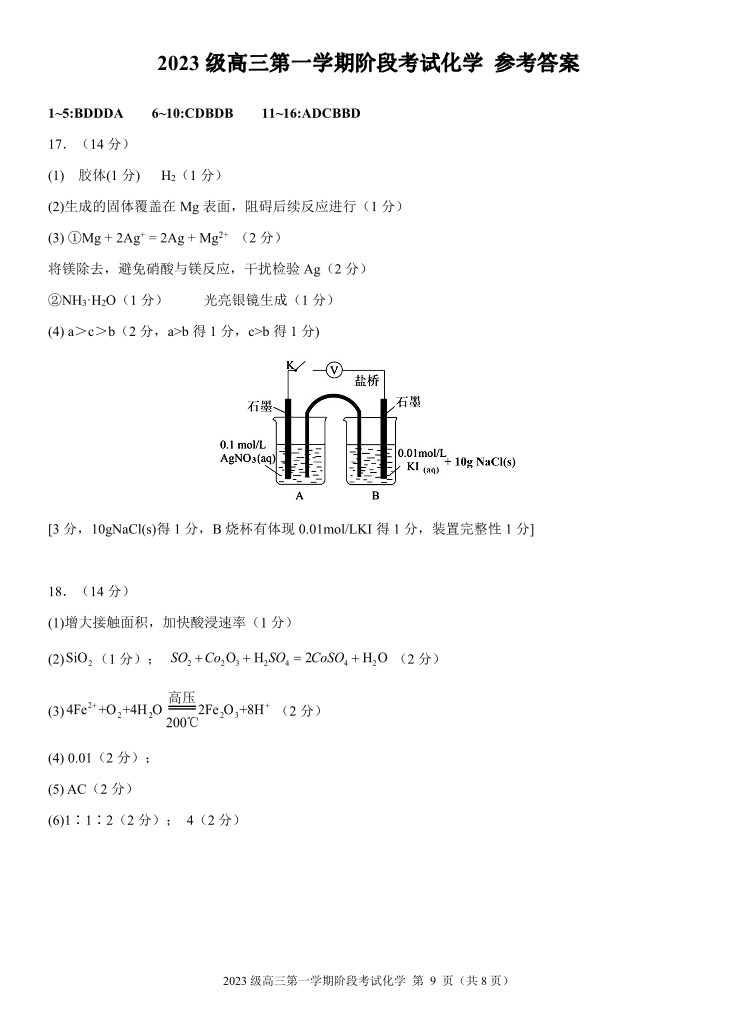 高三化学答案--广东省汕头市金山中学2026届高三上学期10月阶段考试