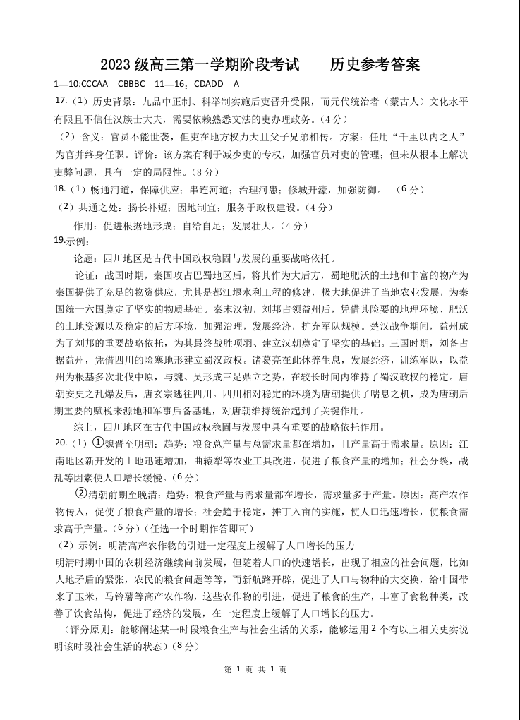高三历史答案--广东省汕头市金山中学2026届高三上学期10月阶段考试